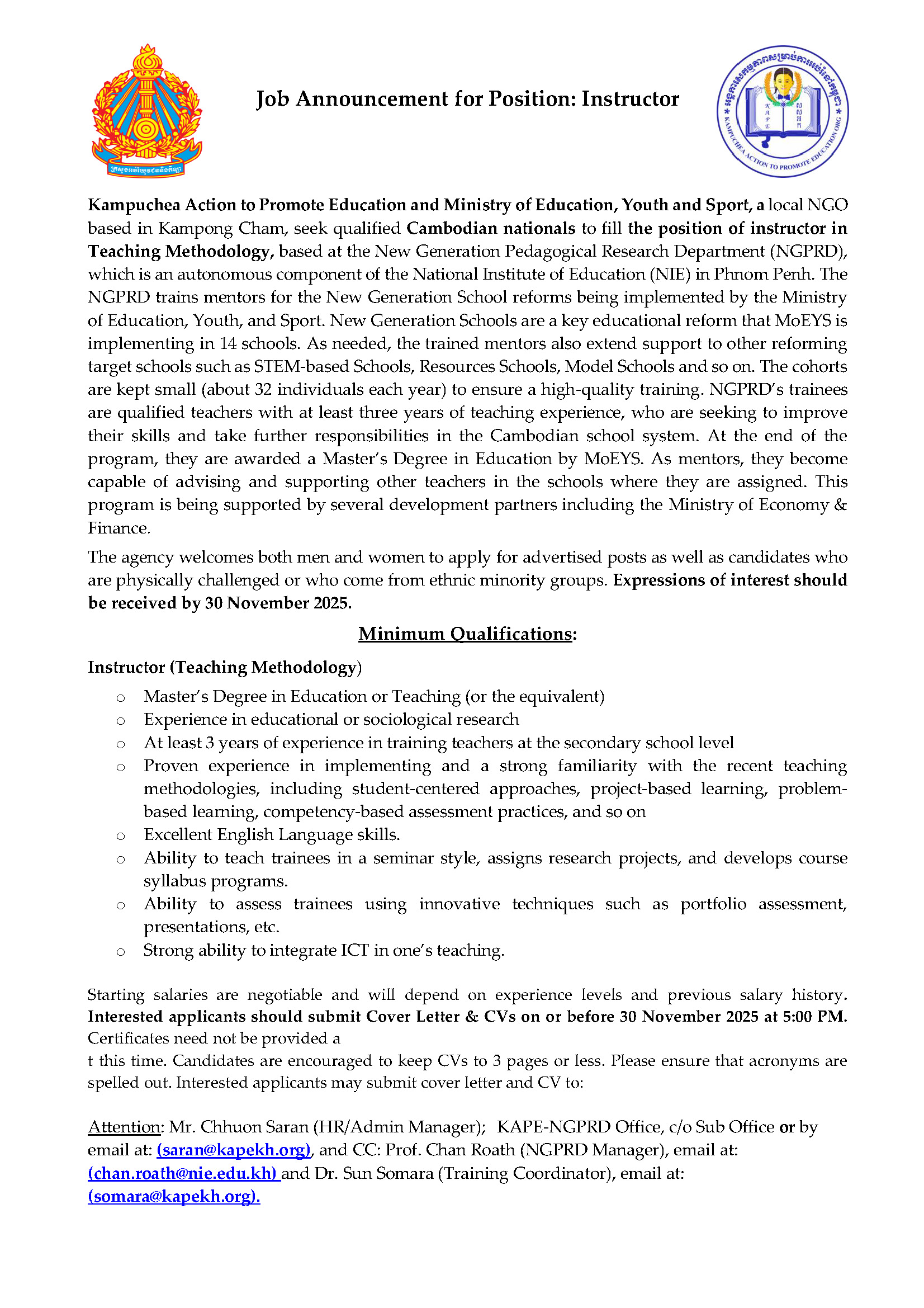 Kampuchea Action to Promote Education and Ministry of Education, Youth and Sport, a local NGO based in Kampong Cham, seek qualified Cambodian nationals to fill the position of instructor in Teaching Methodology, based at the New Generation Pedagogical Research Department (NGPRD), which is an autonomous component of the National Institute of Education (NIE) in Phnom Penh. The NGPRD trains mentors for the New Generation School reforms being implemented by the Ministry of Education, Youth, and Sport. New Generation Schools are a key educational reform that MoEYS is implementing in 14 schools. As needed, the trained mentors also extend support to other reforming target schools such as STEM-based Schools, Resources Schools, Model Schools and so on. The cohorts are kept small (about 32 individuals each year) to ensure a high-quality training. NGPRD’s trainees are qualified teachers with at least three years of teaching experience, who are seeking to improve their skills and take further responsibilities in the Cambodian school system. At the end of the program, they are awarded a Master’s Degree in Education by MoEYS. As mentors, they become capable of advising and supporting other teachers in the schools where they are assigned. This program is being supported by several development partners including the Ministry of Economy & Finance.