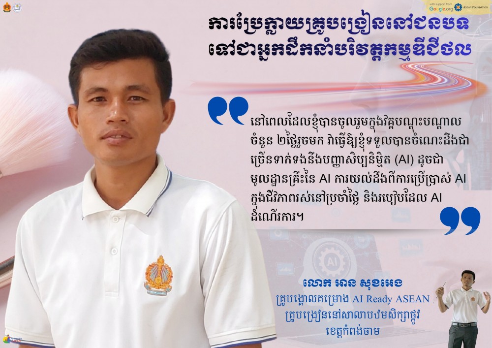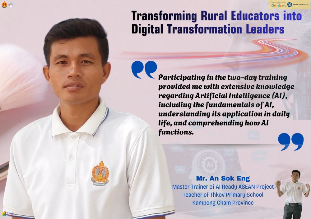 នៅក្នុងយុគសម័យដែលបច្ចេកវិទ្យាកំពុងរីកចម្រើនយ៉ាងឆាប់រហ័ស ការនាំយកចំណេះដឹងផ្នែកឌីជីថលទៅកាន់តំបន់ជនបទគឺជាកត្តាដ៏សំខាន់។ លោក អាន សុខអេង គ្រូបង្រៀននៅសាលាបឋមសិក្សាថ្កូវ ភូមិថ្កូវ ឃុំត្រប់ ស្រុកបាធាយ ខេត្តកំពង់ចាម បានក្លាយជាបុគ្គលគំរូមួយរូបក្នុងការនាំយកការផ្លាស់ប្តូរនេះ។ ក្នុងនាមជាគ្រូបង្គោល (Master Trainer) នៃ គម្រោង AI Ready ASEAN ដែលអនុវត្តដោយអង្គការ ខេប លោកមិនត្រឹមតែបានអភិវឌ្ឍខ្លួនឯងប៉ុណ្ណោះទេ ប៉ុន្តែថែមទាំងបានក្លាយជាស្ពានចម្លងចំណេះដឹងដ៏មានប្រសិទ្ធភាពទៅកាន់សហគមន៍គ្រូបង្រៀនរបស់គាត់ផងដែរ។