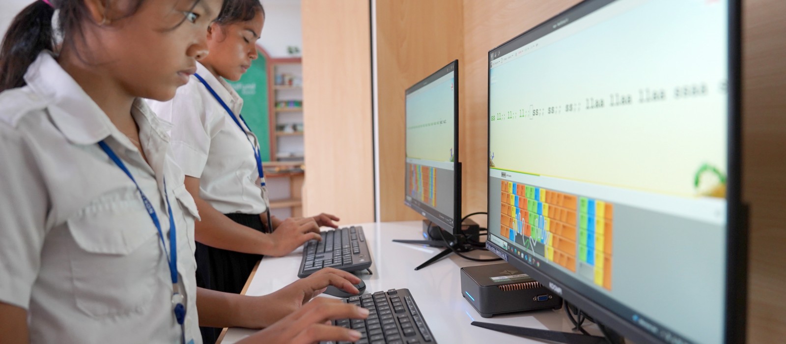 The Grade 6 students of Rokar Kaong 2 PS use the computer desktops to practice the typing skill in the 21st century library supported by IDEAL project.