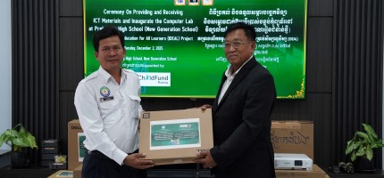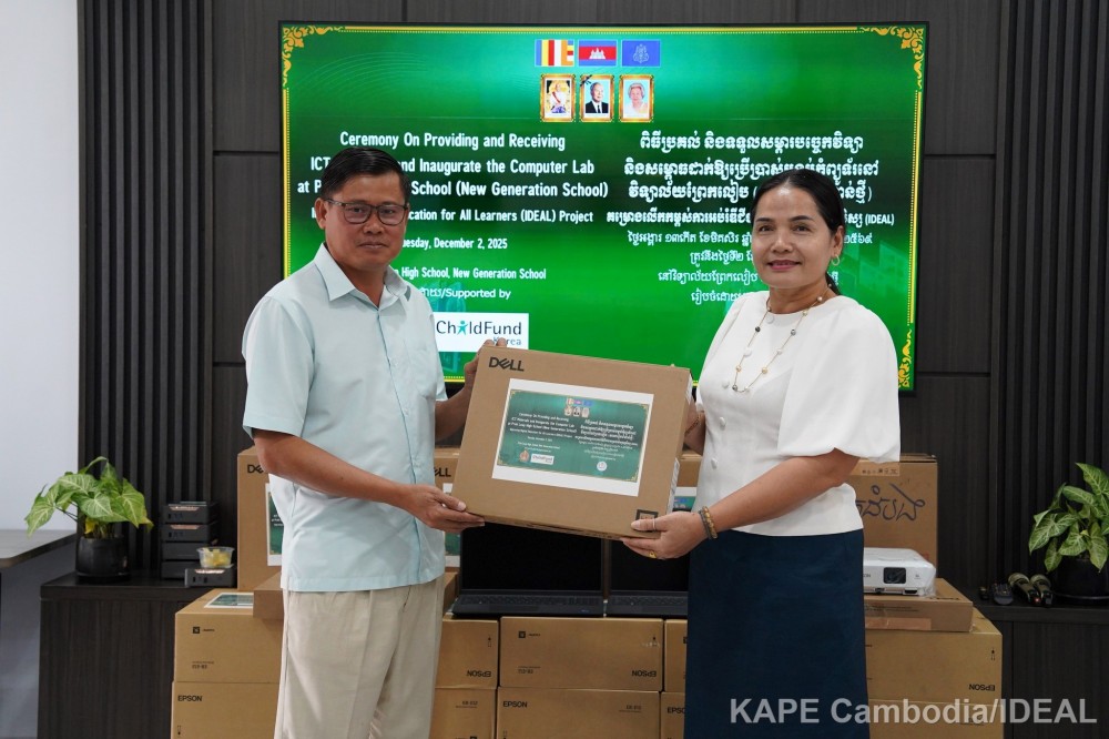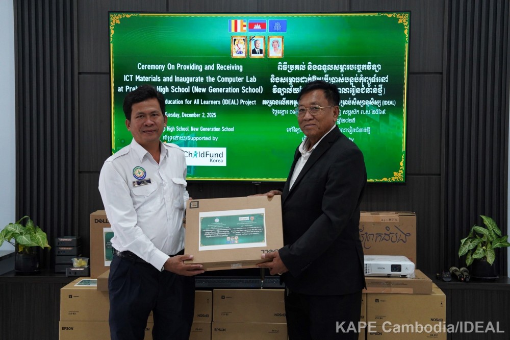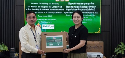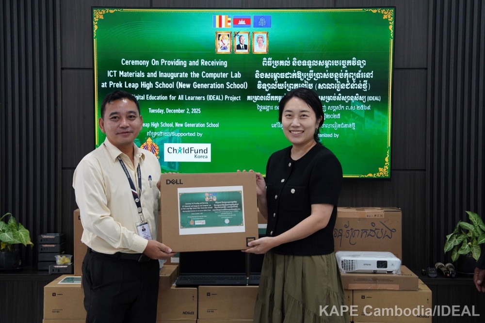 Phnom Penh: On December 2, 2025, in response to the growing demand for digital skills and Artificial Intelligence (AI) literacy in education, the “Improving Digital Education for All Learners (IDEAL)” project, funded by ChorogUsan for Children (ChildFund Korea), successfully held a handover ceremony for technology equipment and officially inaugurated a new Computer Lab at Prek Leap High School (New Generation School).