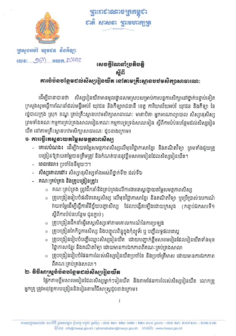 - Distance Adaptive Learning (as soon as the school opens): remedial learning packages (កញ្ចប់ឯកសារការសិក្សាបំប៉នបន្ថែម) to support children to reinforce core competencies in Math and Khmer, to allow them to being able to learn in the future Grades.