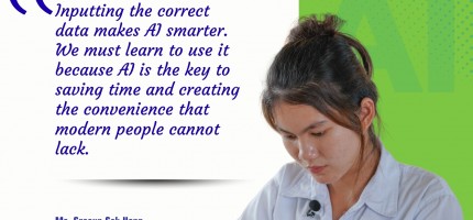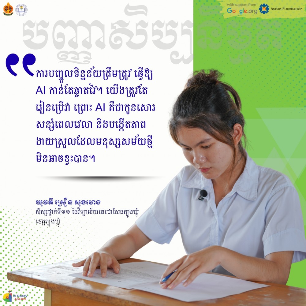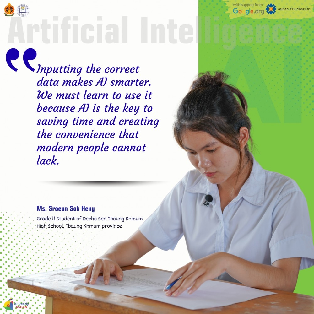In an era where digital technology is growing rapidly, possessing basic computer skills is one thing, but having a deep understanding of "Artificial Intelligence (AI)" is the new key to unlocking the future. Ms. Sroeun Sok Heng, a Grade 11 student at Techo Sen Tbaung Khmum High School, is a prime example of the new generation. She has transformed herself from an ordinary technology user into someone who uses AI effectively and responsibly after participating in the "AI Literacy Training," hosted by AI Ready ASEAN project (AI RAP), implemented by Kampuchea Action to Promote Education (KAPE) cooperated with Department of Digital Transformation (DDT), led by the ASEAN Foundation with financial support from Google.org.