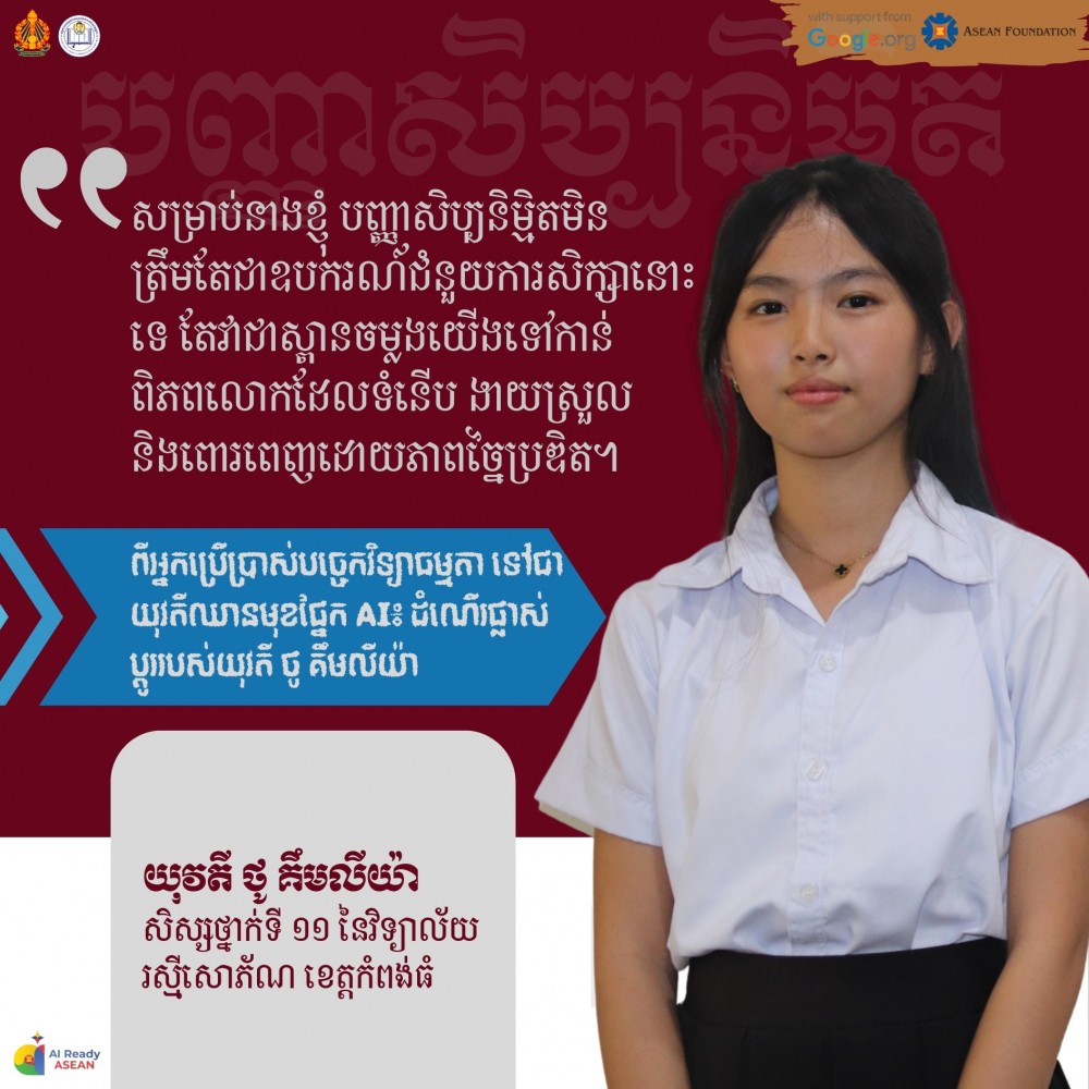 Before participating in the "AI Literacy Training," implemented by KAPE with cooperation with Department of Digital Transformation (DDT), led by ASEAN Foundation and funded by Google.org, Kimliya faced several challenges in using AI, often struggling to utilize it to its full potential. However, after completing the training, she turned those obstacles into opportunities. Today, she navigates AI tools smoothly and with confidence. To her, AI is a powerful technology that simplifies human tasks and makes studying twice as easy and efficient.